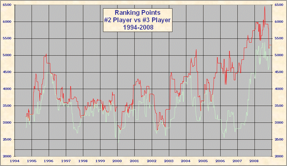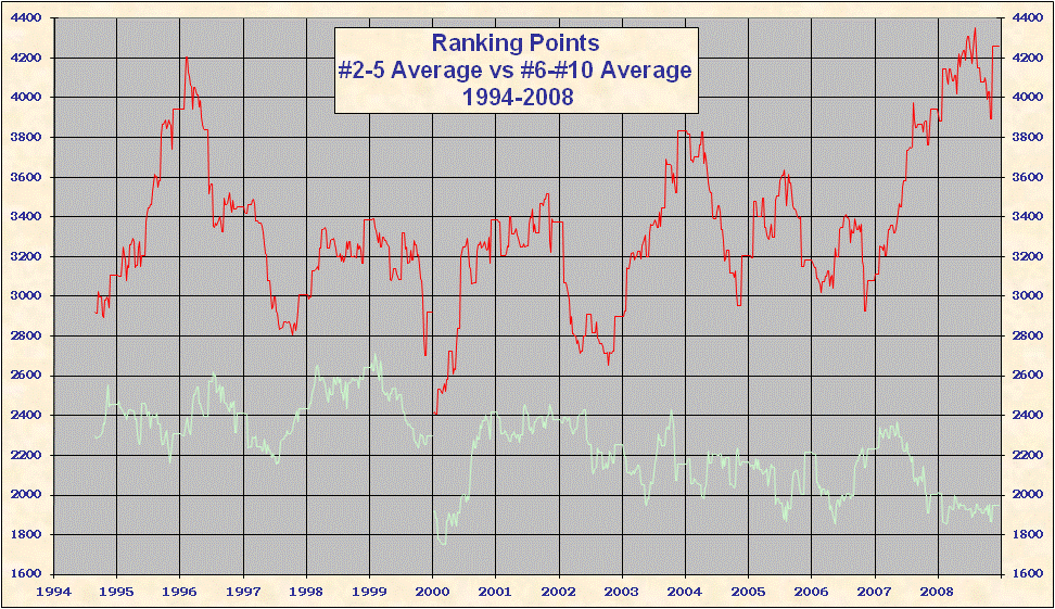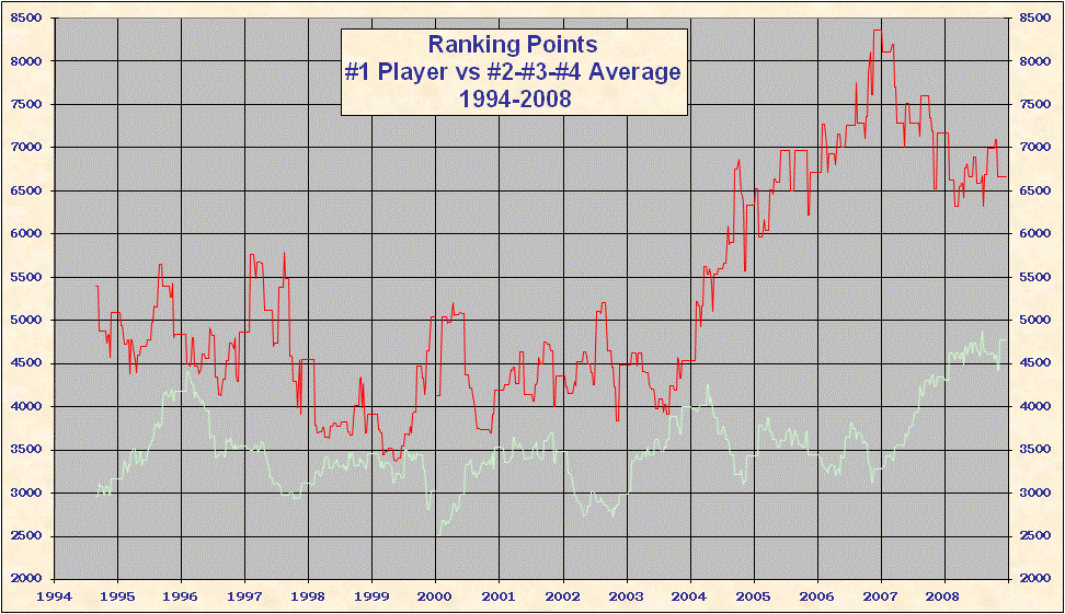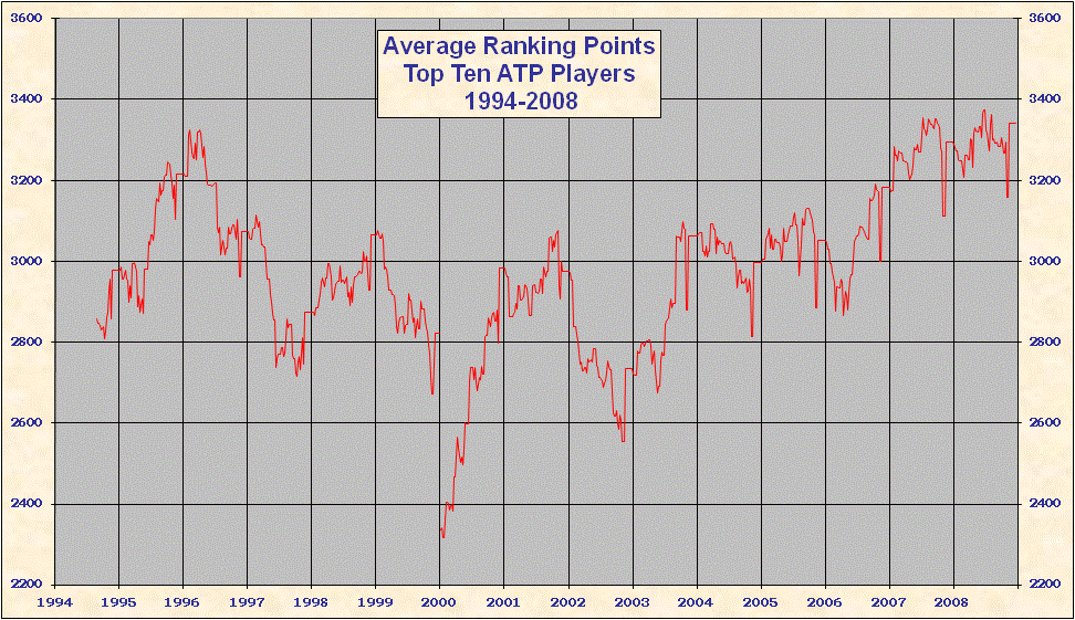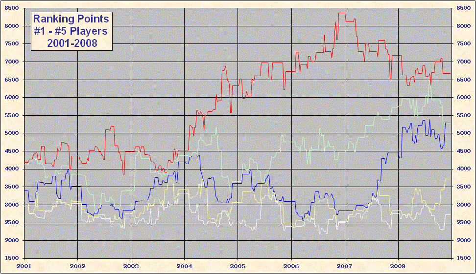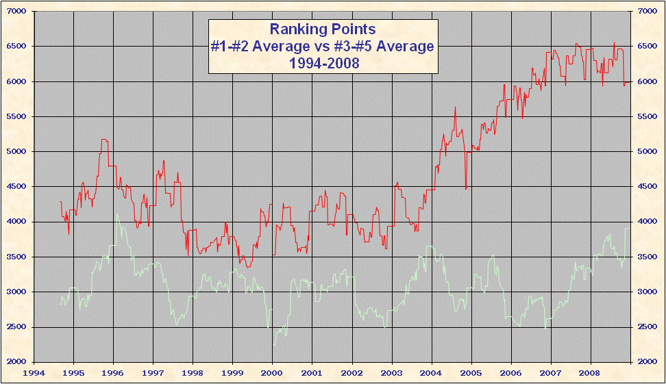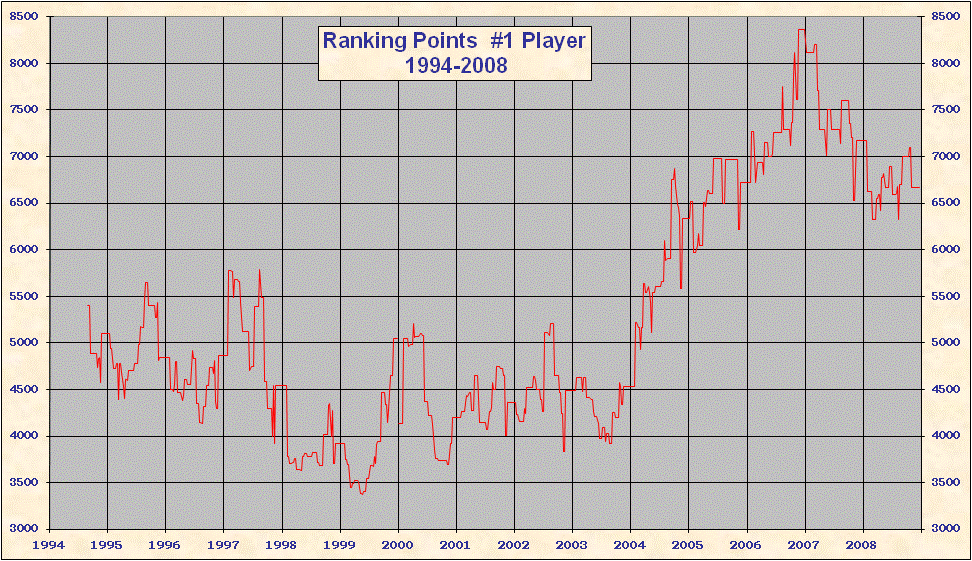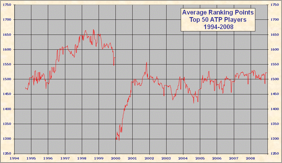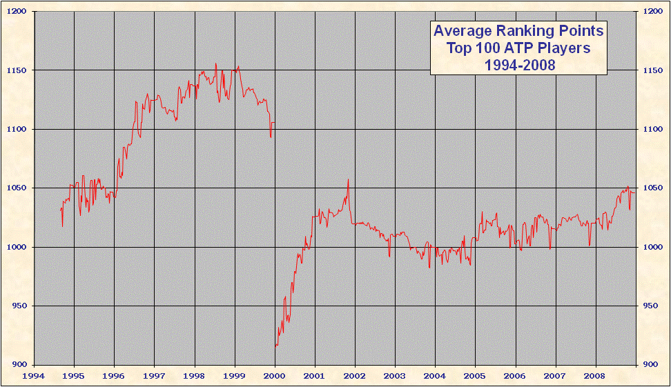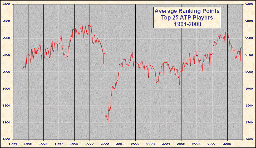 * 2000 results are not included in the above table. When the ATP converted to a new rank system in 2000 all existing point totals were cut by ~ 15%-20% in an attempt to graft the new system onto 1999 results. This explains the discontinuity on all the charts. Looking at Top 25/50/100 charts it is evident that ATP overshot the point reduction; as 1999 results came off and 2000 results were added totals rose until the points were entirely from the new best 18 system. Nearly all 'weakest' best 18 2000-2005 group totals are from early 2000, just after system conversion - see below. |