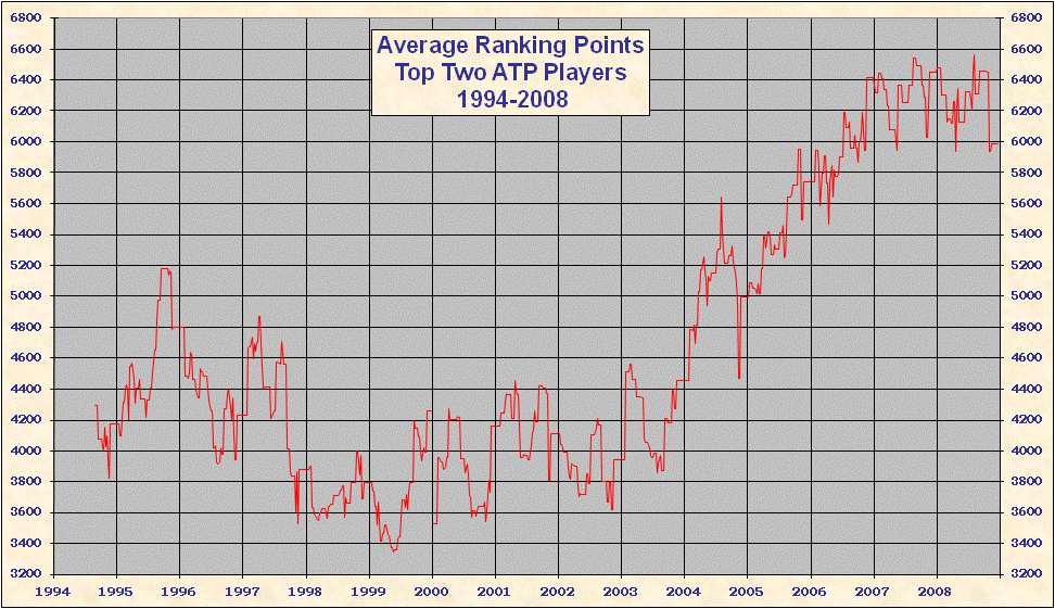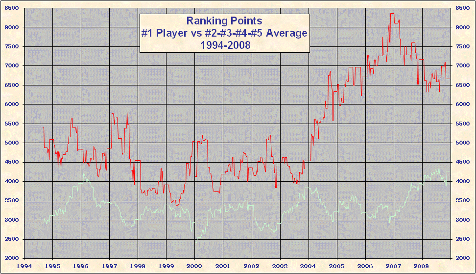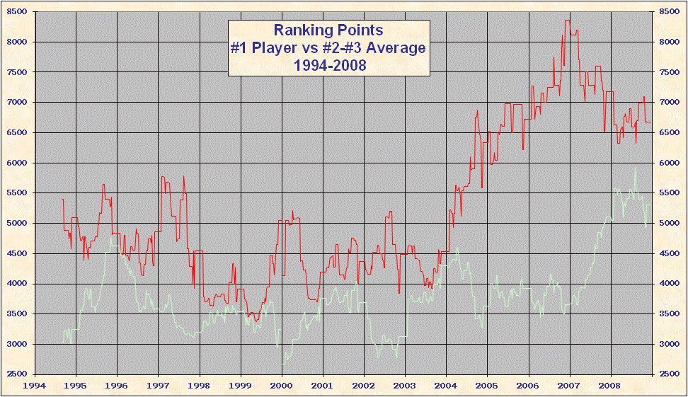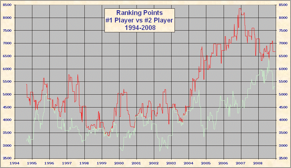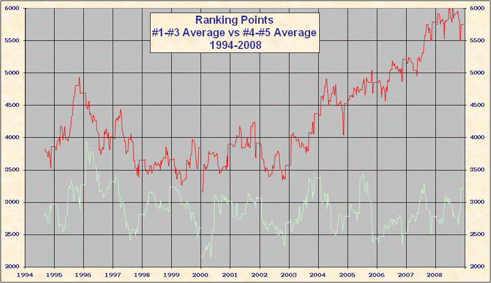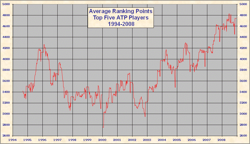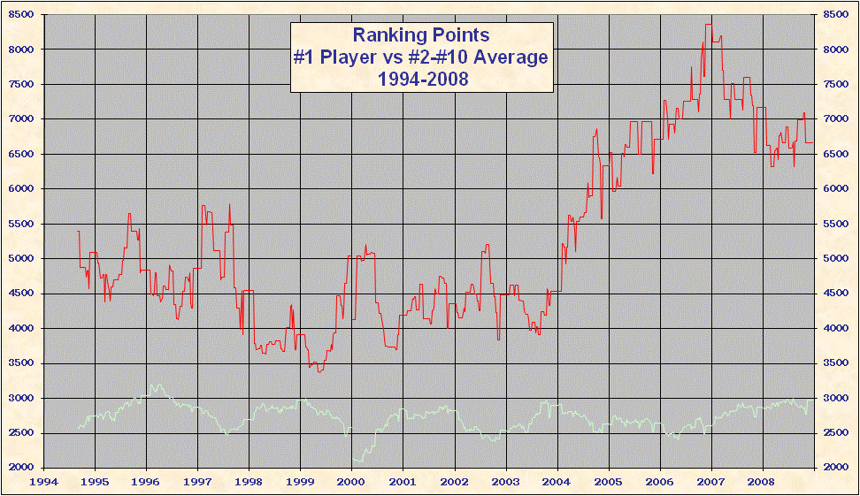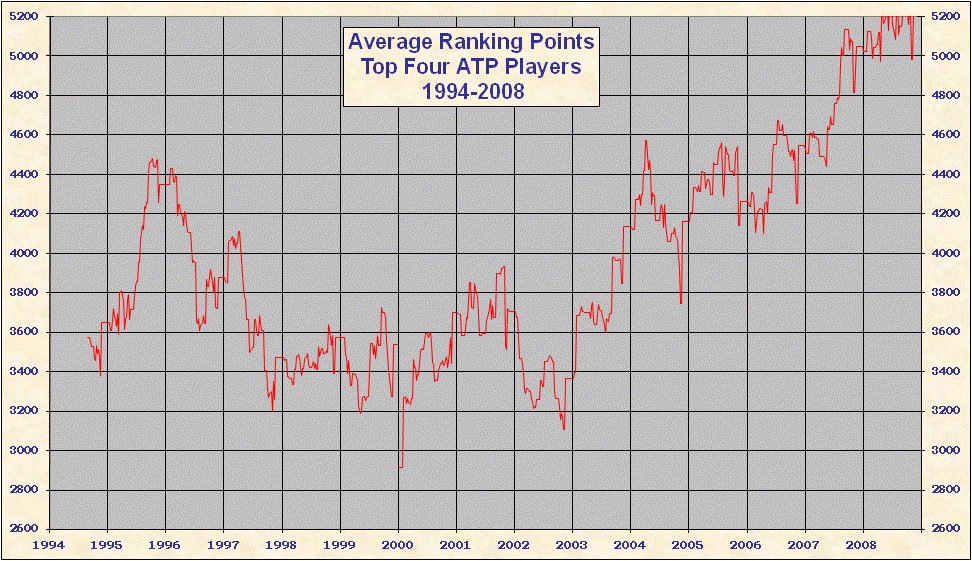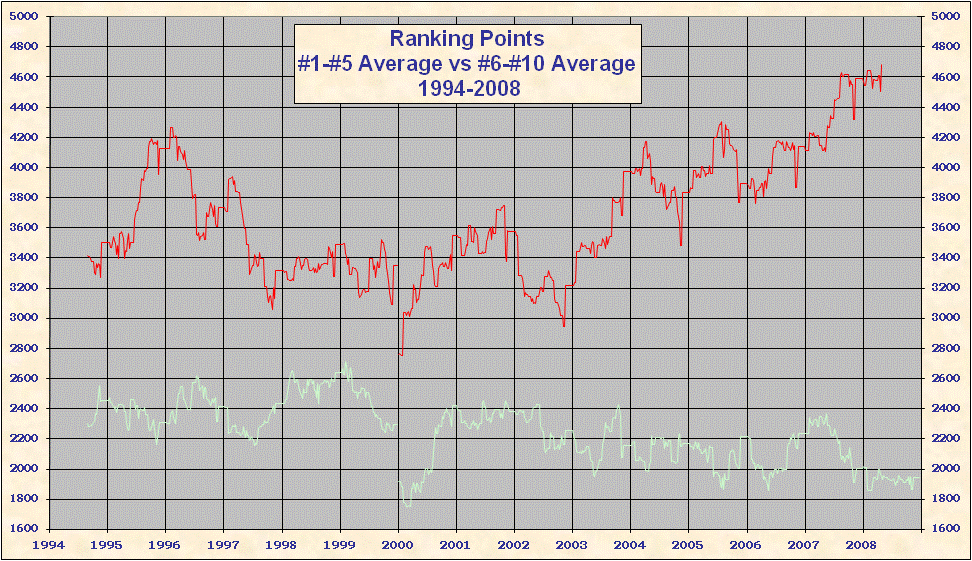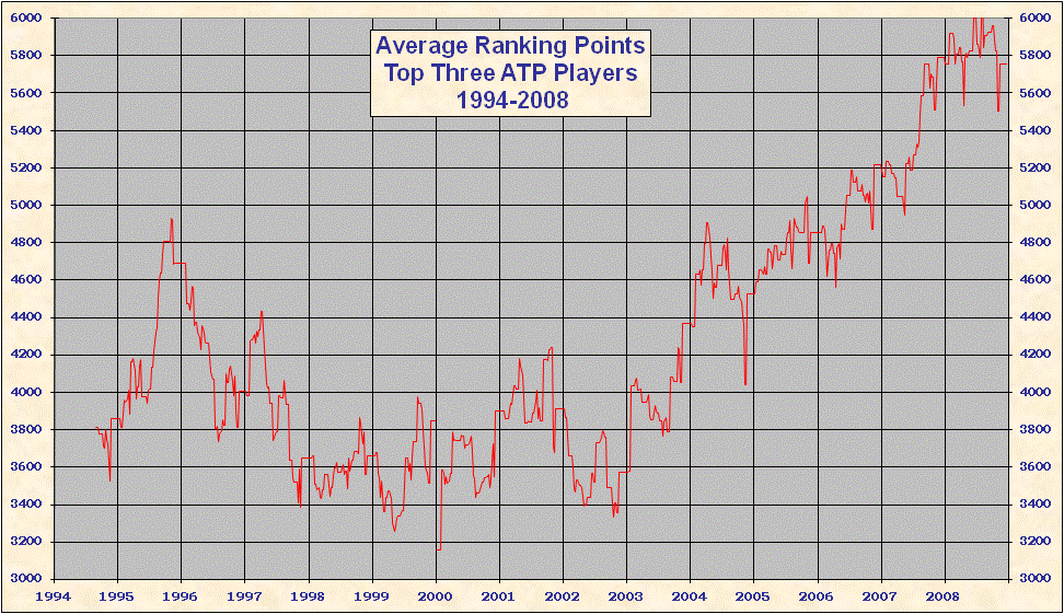 * 2000 results are not included in the above table. When the ATP converted to a new rank system in 2000 all existing point totals were cut by ~ 15%-20% in an attempt to graft the new system onto 1999 results. This explains the discontinuity on all the charts. Looking at Top 25/50/100 charts it is evident that ATP overshot the point reduction; as 1999 results came off and 2000 results were added totals rose until the points were entirely from the new best 18 system. Nearly all 'weakest' best 18 2000-2005 group totals are from early 2000, just after system conversion - see below. |