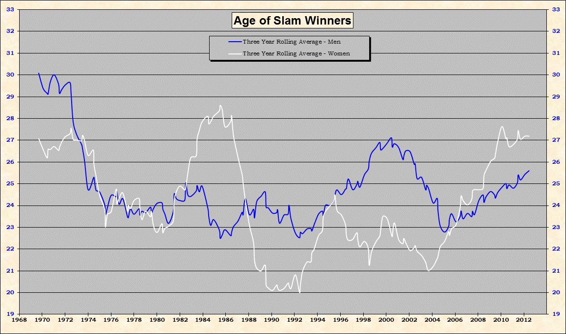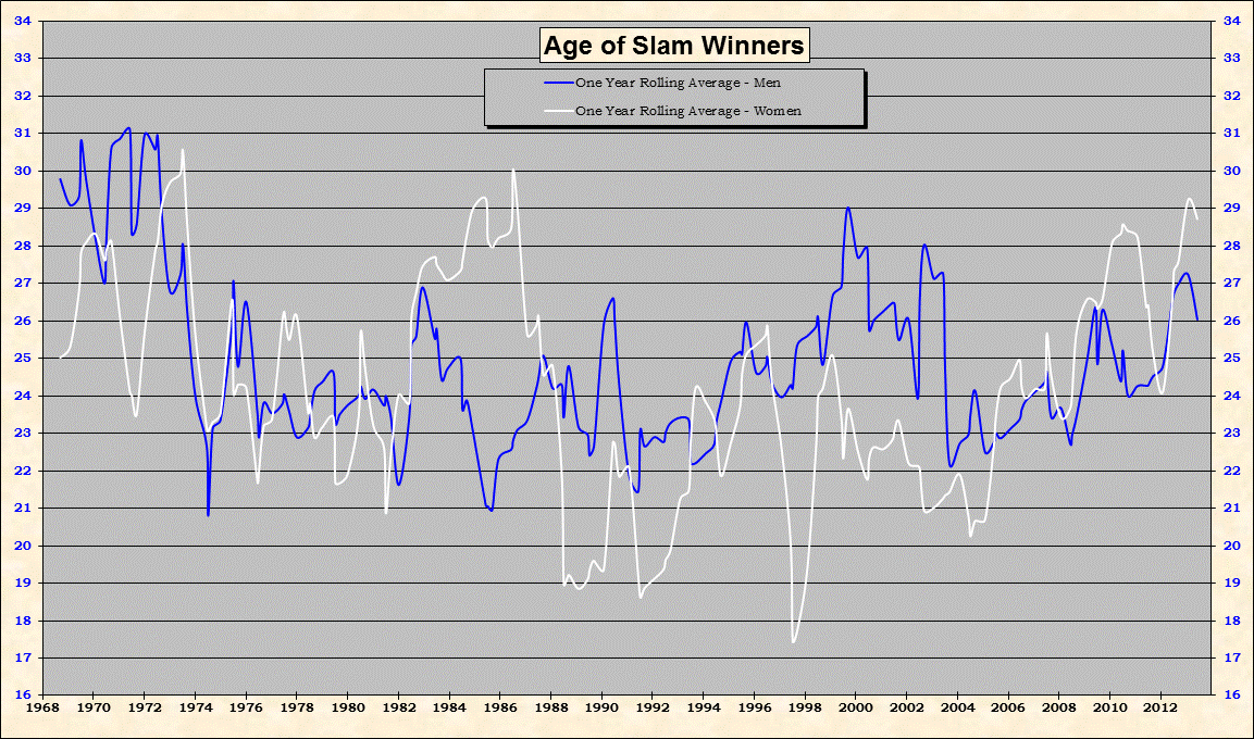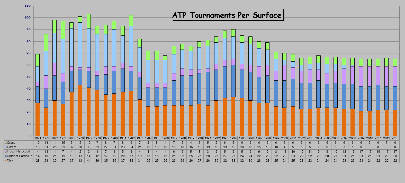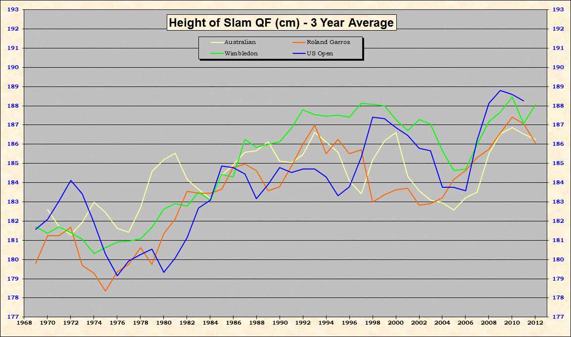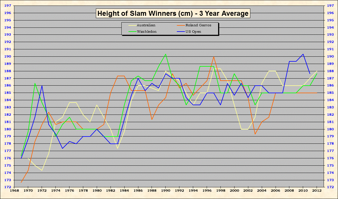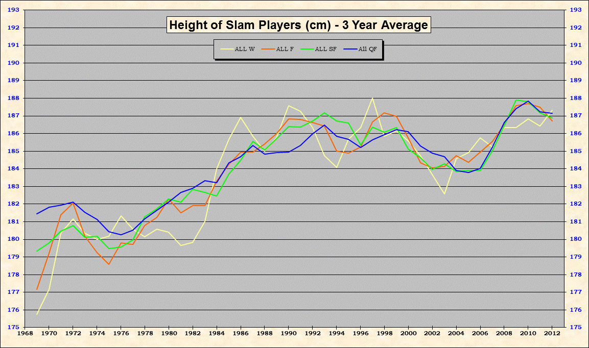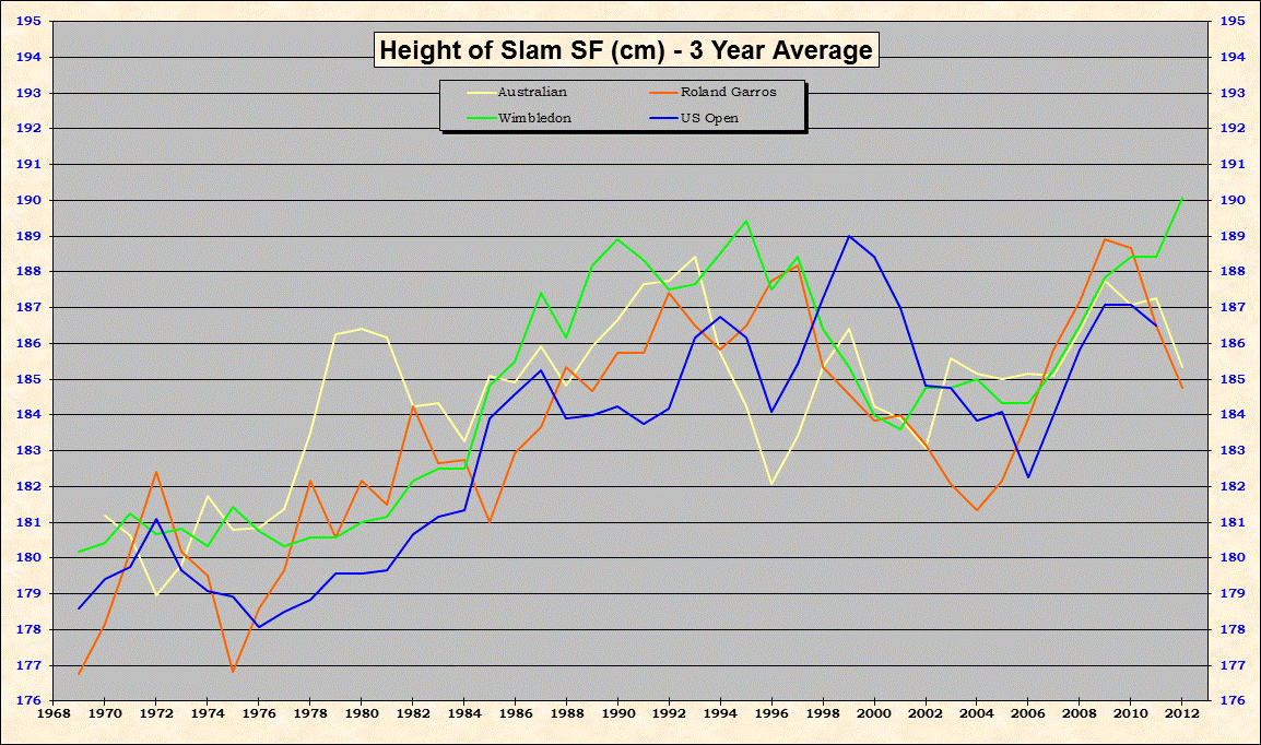 Player Comparisons Federer vs. Sampras Agassi vs. Sampras Federer vs. Nadal Borg vs. Nadal New Balls (Federer-Hewitt-Safin-Ferrero-Roddick) Young Guns (Nadal-Djokovic-Murray-Del Potro) Other Agassi Career Clay Warmups Revenge At Slams Hack Factor Top 300 per Country Graphs ATP Tournament Surfaces 1971-2013 Men vs. Women Slam Winners Age Graphs Total One Year Rolling Three Year Rolling Player Height Graphs Slams Per Year Winners Finalists SFs QFs 5 Set % Top Four Seeds in SF % |